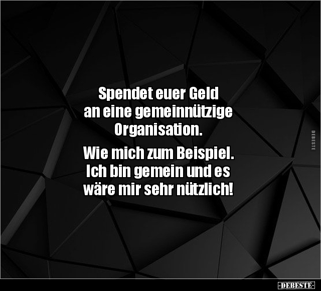 Spendet euer Geld an eine gemeinnützige Organisation. Wie mich zum Beispiel. Ich bin gemein und es wäre mir sehr nützlich!