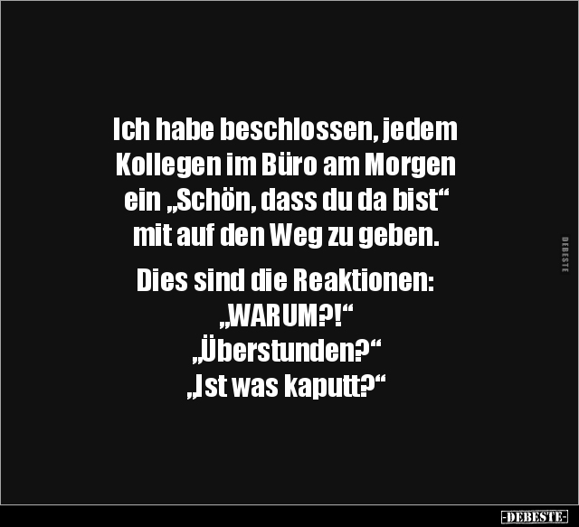 Ich habe beschlossen, jedem Kollegen im Büro am Morgen ein „Schön, dass du da bist“ mit auf den Weg zu geben. Dies sind die Reaktionen: „WARUM?!“ „Überstunden?“ „Ist was kaputt?“