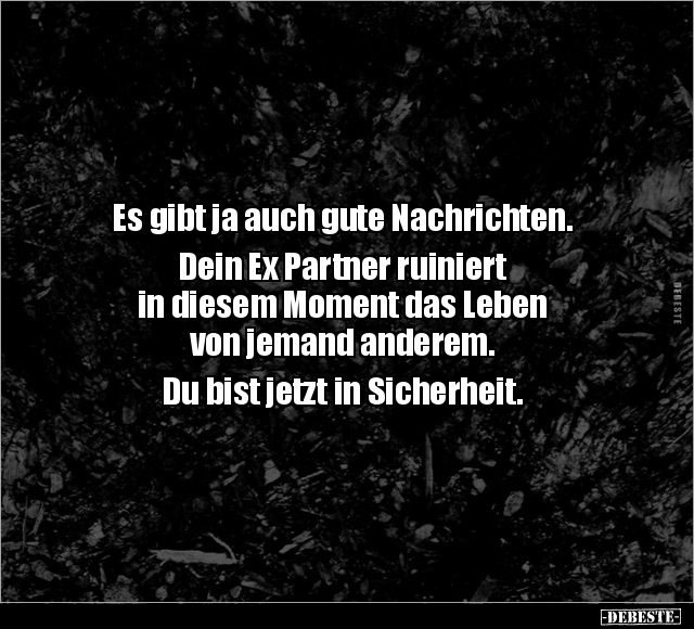 Es gibt ja auch gute Nachrichten. Dein Ex Partner ruiniert in diesem Moment das Leben von jemand anderem. Du bist jetzt in Sicherheit.