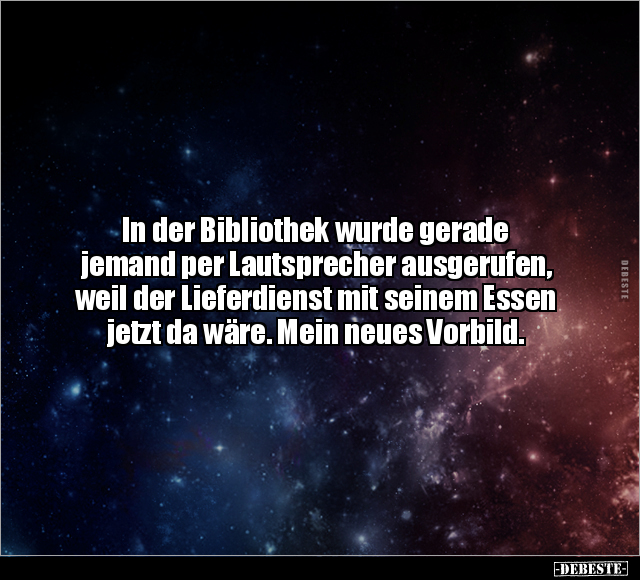 In der Bibliothek wurde gerade jemand per Lautsprecher ausgerufen, weil der Lieferdienst mit seinem Essen jetzt da wäre. Mein neues Vorbild.