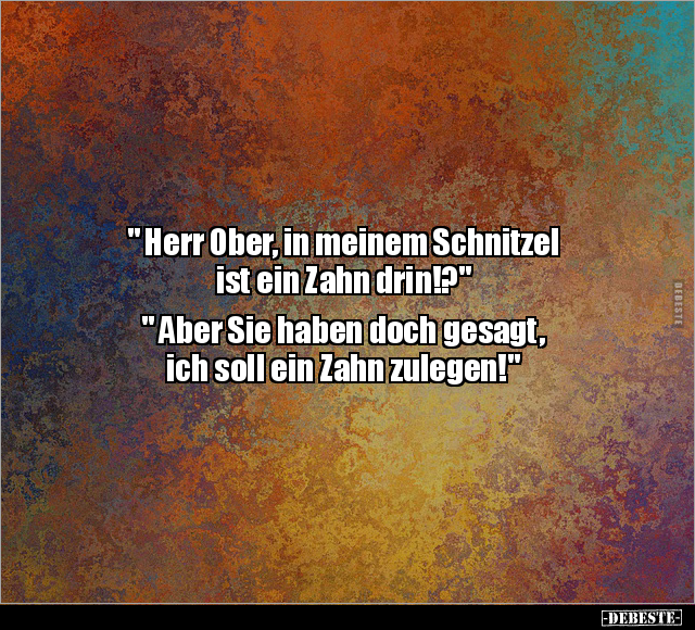 " Herr Ober, in meinem Schnitzel ist ein Zahn drin!?" " Aber Sie haben doch gesagt, ich soll ein Zahn zulegen!"