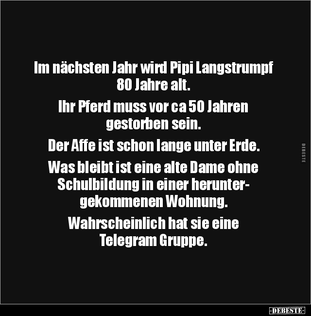 Im nächsten Jahr wird Pipi Langstrumpf 80 Jahre alt. Ihr Pferd muss vor ca 50 Jahren gestorben sein. Der Affe ist schon lange unter Erde. Was bleibt ist eine alte Dame ohne Schulbildung in einer herunter- gekommenen Wohnung. Wahrscheinlich hat sie eine Telegram Gruppe.