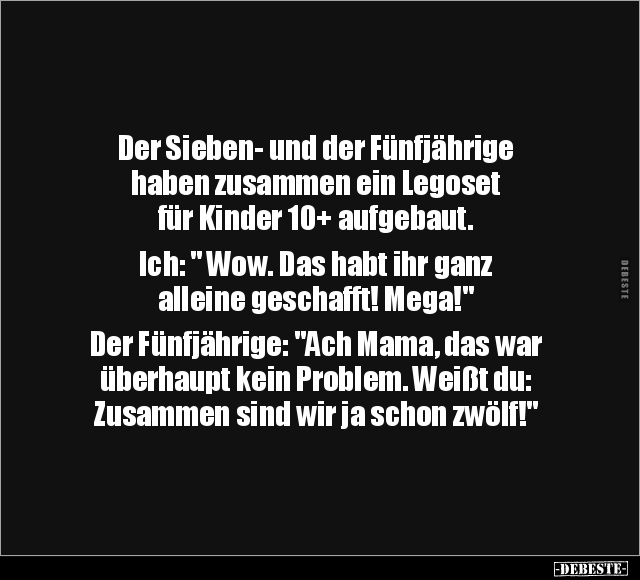 Der Sieben- und der Fünfjährige haben zusammen ein Legoset für Kinder 10+ aufgebaut. Ich: " Wow. Das habt ihr ganz alleine geschafft! Mega!" Der Fünfjährige: "Ach Mama, das war überhaupt kein Problem. Weißt du: Zusammen sind wir ja schon zwölf!"