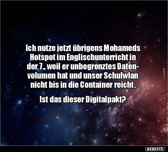 Ich nutze jetzt übrigens Mohameds Hotspot im Englischunterricht in der 7., weil er unbegrenztes Daten- volumen hat und unser Schulwlan nicht bis in die Container reicht. Ist das dieser Digitalpakt?