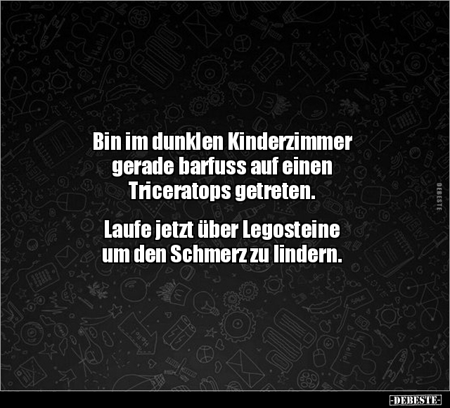 Bin im dunklen Kinderzimmer gerade barfuss auf einen Triceratops getreten. Laufe jetzt über Legosteine um den Schmerz zu lindern.