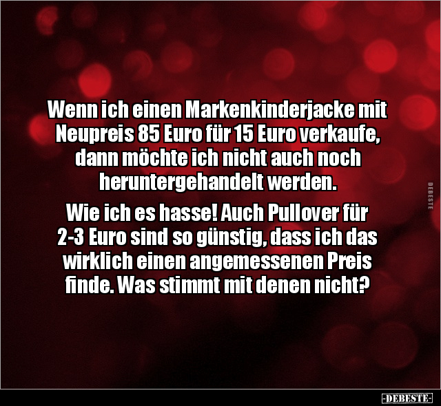 Wenn ich einen Markenkinderjacke mit Neupreis 85 Euro für 15 Euro verkaufe, dann möchte ich nicht auch noch heruntergehandelt werden. Wie ich es hasse! Auch Pullover für 2-3 Euro sind so günstig, dass ich das wirklich einen angemessenen Preis finde. Was stimmt mit denen nicht?