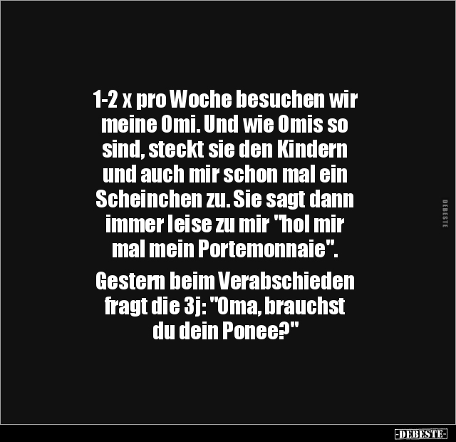 1-2 x pro Woche besuchen wir meine Omi. Und wie Omis so sind, steckt sie den Kindern und auch mir schon mal ein Scheinchen zu. Sie sagt dann immer leise zu mir "hol mir mal mein Portemonnaie". Gestern beim Verabschieden fragt die 3j: "Oma, brauchst du dein Ponee?"