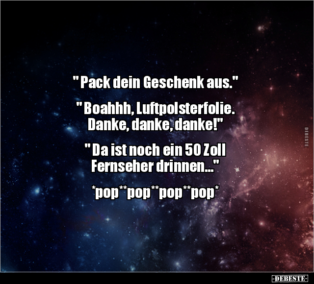 " Pack dein Geschenk aus." " Boahhh, Luftpolsterfolie. Danke, danke, danke!" " Da ist noch ein 50 Zoll Fernseher drinnen..." *pop**pop**pop**pop*