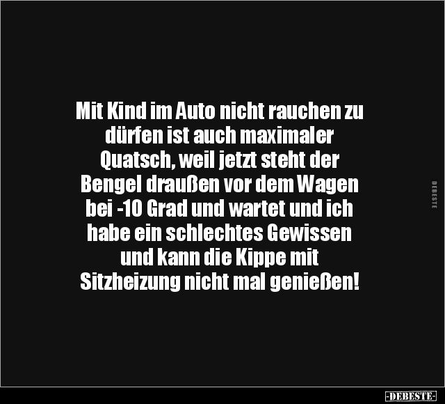 Mit Kind im Auto nicht rauchen zu dürfen ist auch maximaler Quatsch, weil jetzt steht der Bengel draußen vor dem Wagen bei -10 Grad und wartet und ich habe ein schlechtes Gewissen und kann die Kippe mit Sitzheizung nicht mal genießen!