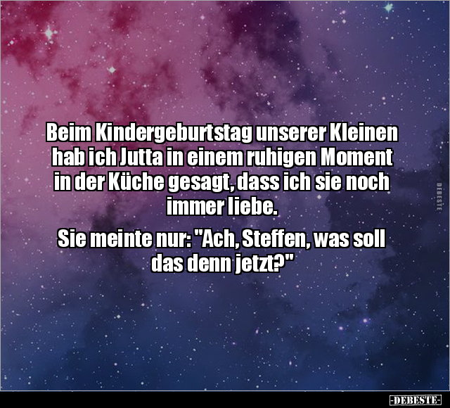 Beim Kindergeburtstag unserer Kleinen hab ich Jutta in einem ruhigen Moment in der Küche gesagt, dass ich sie noch immer liebe. Sie meinte nur: "Ach, Steffen, was soll das denn jetzt?"