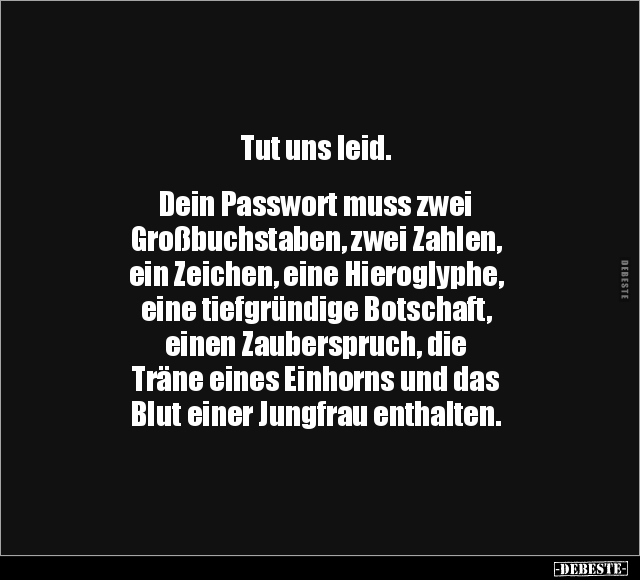 Tut uns leid. Dein Passwort muss zwei Großbuchstaben, zwei Zahlen, ein Zeichen, eine Hieroglyphe, eine tiefgründige Botschaft, einen Zauberspruch, die Träne eines Einhorns und das Blut einer Jungfrau enthalten.
