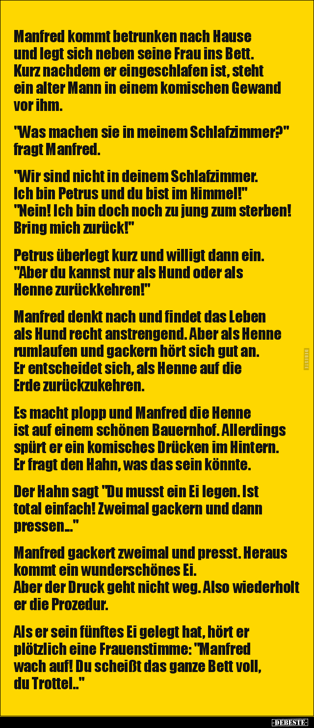 Manfred kommt betrunken nach Hause und legt sich neben seine Frau ins Bett. Kurz nachdem er eingeschlafen ist, steht ein alter Mann in einem komischen Gewand vor ihm. "Was machen sie in meinem Schlafzimmer?" fragt Manfred. "Wir sind nicht in deinem Schlafzimmer. Ich bin Petrus und du bist im Himmel!" "Nein! Ich bin doch noch zu jung zum sterben! Bring mich zurück!" Petrus überlegt kurz und willigt dann ein. "Aber du kannst nur als Hund oder als Henne zurückkehren!" Manfred denkt nach und findet das Leben als Hund recht anstrengend. Aber als Henne rumlaufen und gackern hört sich gut an. Er entscheidet sich, als Henne auf die Erde zurückzukehren. Es macht plopp und Manfred die Henne ist auf einem schönen Bauernhof. Allerdings spürt er ein komisches Drücken im Hintern. Er fragt den Hahn, was das sein könnte. Der Hahn sagt "Du musst ein Ei legen. Ist total einfach! Zweimal gackern und dann pressen..." Manfred gackert zweimal und presst. Heraus kommt ein wunderschönes Ei. Aber der Druck geht nicht weg. Also wiederholt er die Prozedur. Als er sein fünftes Ei gelegt hat, hört er plötzlich eine Frauenstimme: "Manfred wach auf! Du scheißt das ganze Bett voll, du Trottel.."