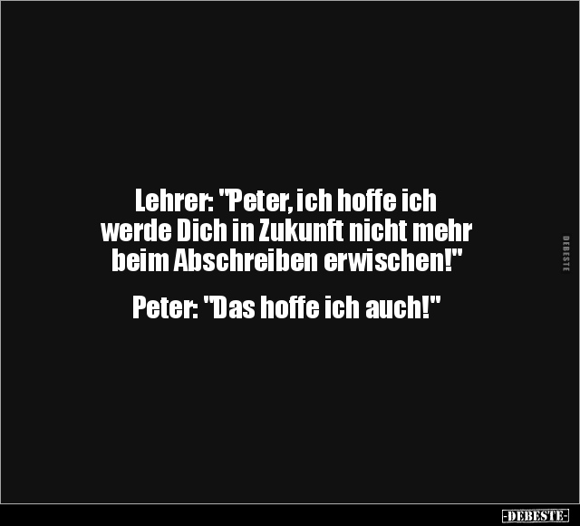 Lehrer: "Peter, ich hoffe ich werde Dich in Zukunft nicht mehr beim Abschreiben erwischen!" Peter: "Das hoffe ich auch!"