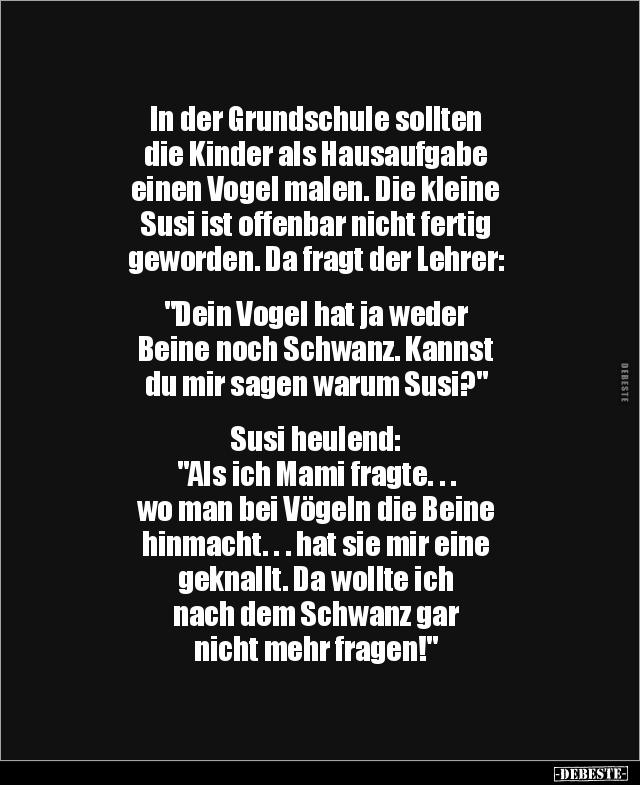 In der Grundschule sollten die Kinder als Hausaufgabe einen Vogel malen. Die kleine Susi ist offenbar nicht fertig geworden. Da fragt der Lehrer: "Dein Vogel hat ja weder Beine noch Schwanz. Kannst du mir sagen warum Susi?" Susi heulend: "Als ich Mami fragte. . . wo man bei Vögeln die Beine hinmacht. . . hat sie mir eine geknallt. Da wollte ich nach dem Schwanz gar nicht mehr fragen!"