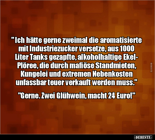 " Ich hätte gerne zweimal die aromatisierte mit Industriezucker versetze, aus 1000 Liter Tanks gezapfte, alkoholhaltige Ekel- Plöree, die durch mafiöse Standmieten, Kungelei und extremen Nebenkosten unfassbar teuer verkauft werden muss." "Gerne. Zwei Glühwein, macht 24 Euro!"