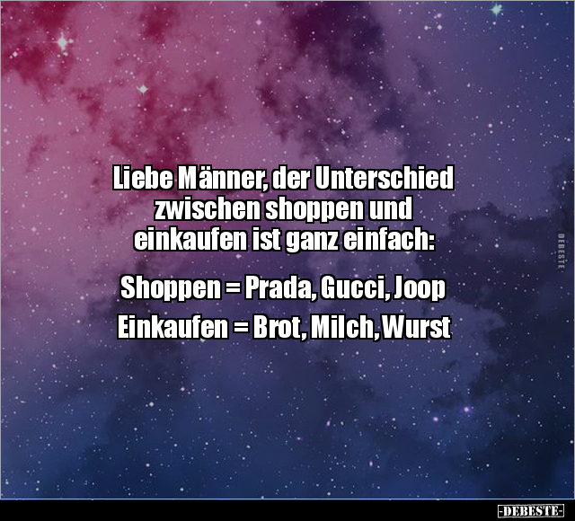 Liebe Männer, der Unterschied zwischen shoppen und einkaufen ist ganz einfach: Shoppen = Prada, Gucci, Joop Einkaufen = Brot, Milch, Wurst