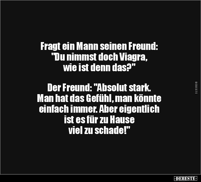 Fragt ein Mann seinen Freund: "Du nimmst doch Viagra, wie ist denn das?" Der Freund: "Absolut stark. Man hat das Gefühl, man könnte einfach immer. Aber eigentlich ist es für zu Hause viel zu schade!"