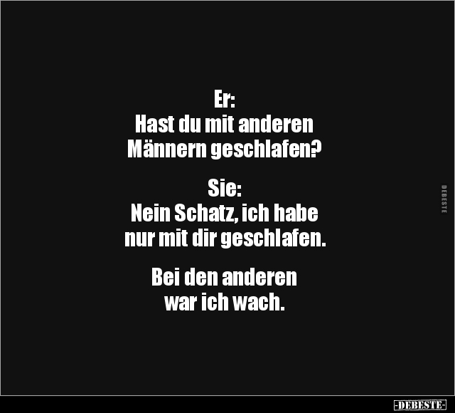 Er: Hast du mit anderen Männern geschlafen? Sie: Nein Schatz, ich habe nur mit dir geschlafen. Bei den anderen war ich wach.