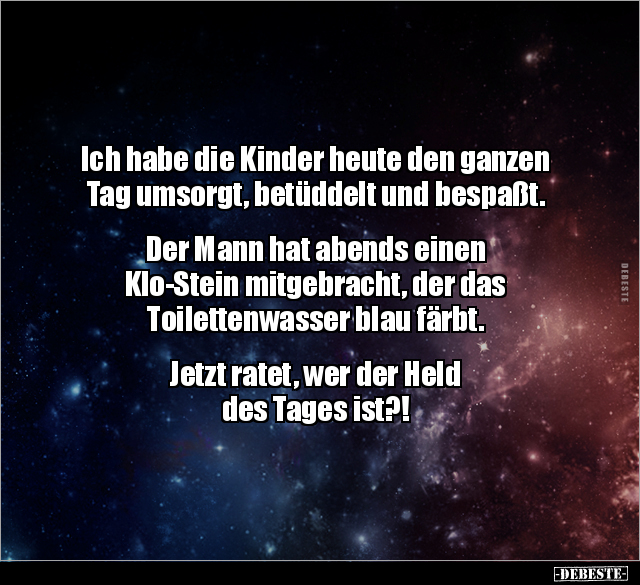 Ich habe die Kinder heute den ganzen Tag umsorgt, betüddelt und bespaßt. Der Mann hat abends einen Klo-Stein mitgebracht, der das Toilettenwasser blau färbt. Jetzt ratet, wer der Held des Tages ist?!