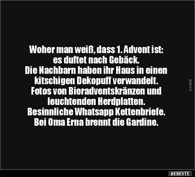 Woher man weiß, dass 1. Advent ist: es duftet nach Gebäck. Die Nachbarn haben ihr Haus in einen kitschigen Dekopuff verwandelt. Fotos von Bieradventskränzen und leuchtenden Herdplatten. Besinnliche Whatsapp Kettenbriefe. Bei Oma Erna brennt die Gardine.