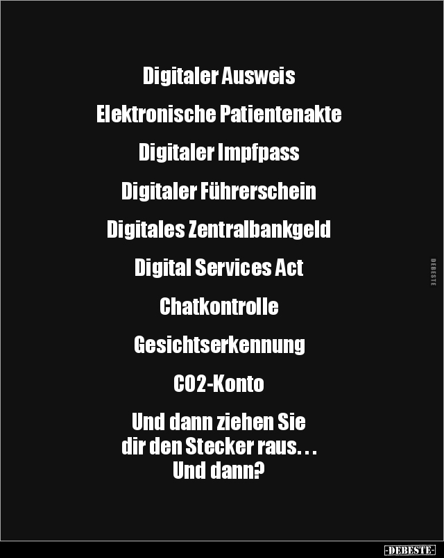 Digitaler Ausweis Elektronische Patientenakte Digitaler Impfpass Digitaler Führerschein Digitales Zentralbankgeld Digital Services Act Chatkontrolle Gesichtserkennung CO2-Konto Und dann ziehen Sie dir den Stecker raus. . . Und dann?