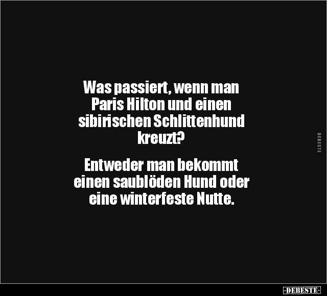 Was passiert, wenn man Paris Hilton und einen sibirischen Schlittenhund kreuzt? Entweder man bekommt einen saublöden Hund oder eine winterfeste Nutte.
