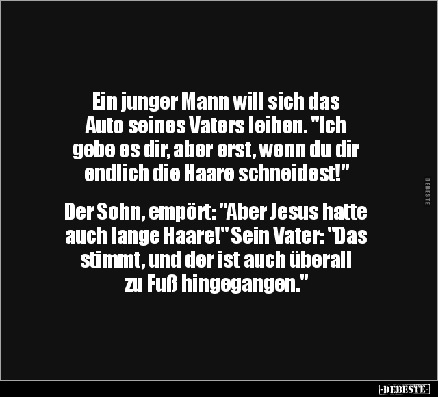 Ein junger Mann will sich das Auto seines Vaters leihen. "Ich gebe es dir, aber erst, wenn du dir endlich die Haare schneidest!" Der Sohn, empört: "Aber Jesus hatte auch lange Haare!" Sein Vater: "Das stimmt, und der ist auch überall zu Fuß hingegangen."