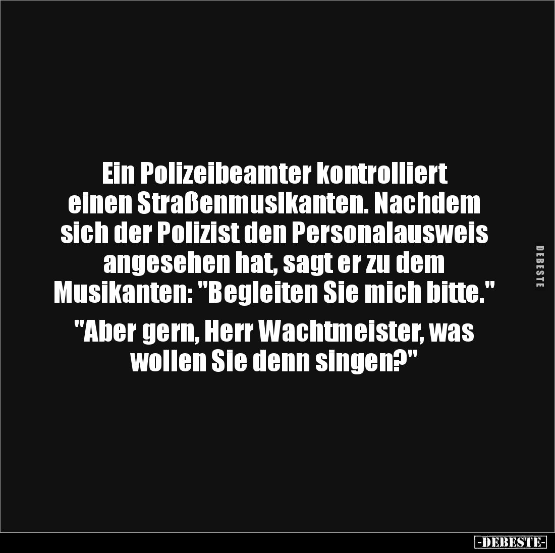 Ein Polizeibeamter kontrolliert einen Straßenmusikanten. Nachdem sich der Polizist den Personalausweis angesehen hat, sagt er zu dem Musikanten: "Begleiten Sie mich bitte." "Aber gern, Herr Wachtmeister, was wollen Sie denn singen?"
