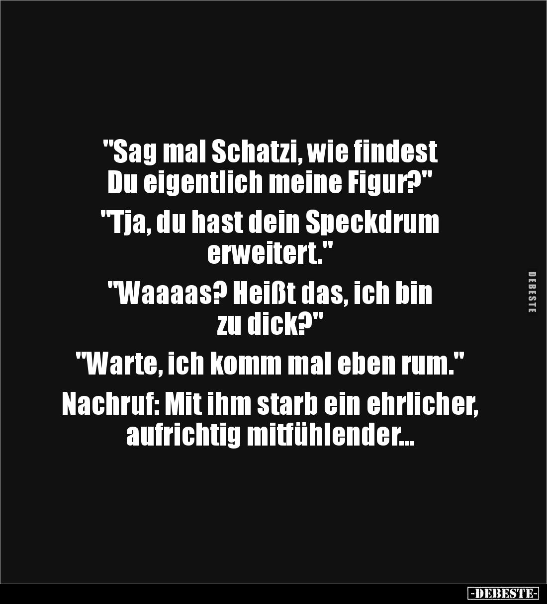 "Sag mal Schatzi, wie findest Du eigentlich meine Figur?" "Tja, du hast dein Speckdrum erweitert." "Waaaas? Heißt das, ich bin zu dick?" "Warte, ich komm mal eben rum." Nachruf: Mit ihm starb ein ehrlicher, aufrichtig mitfühlender...