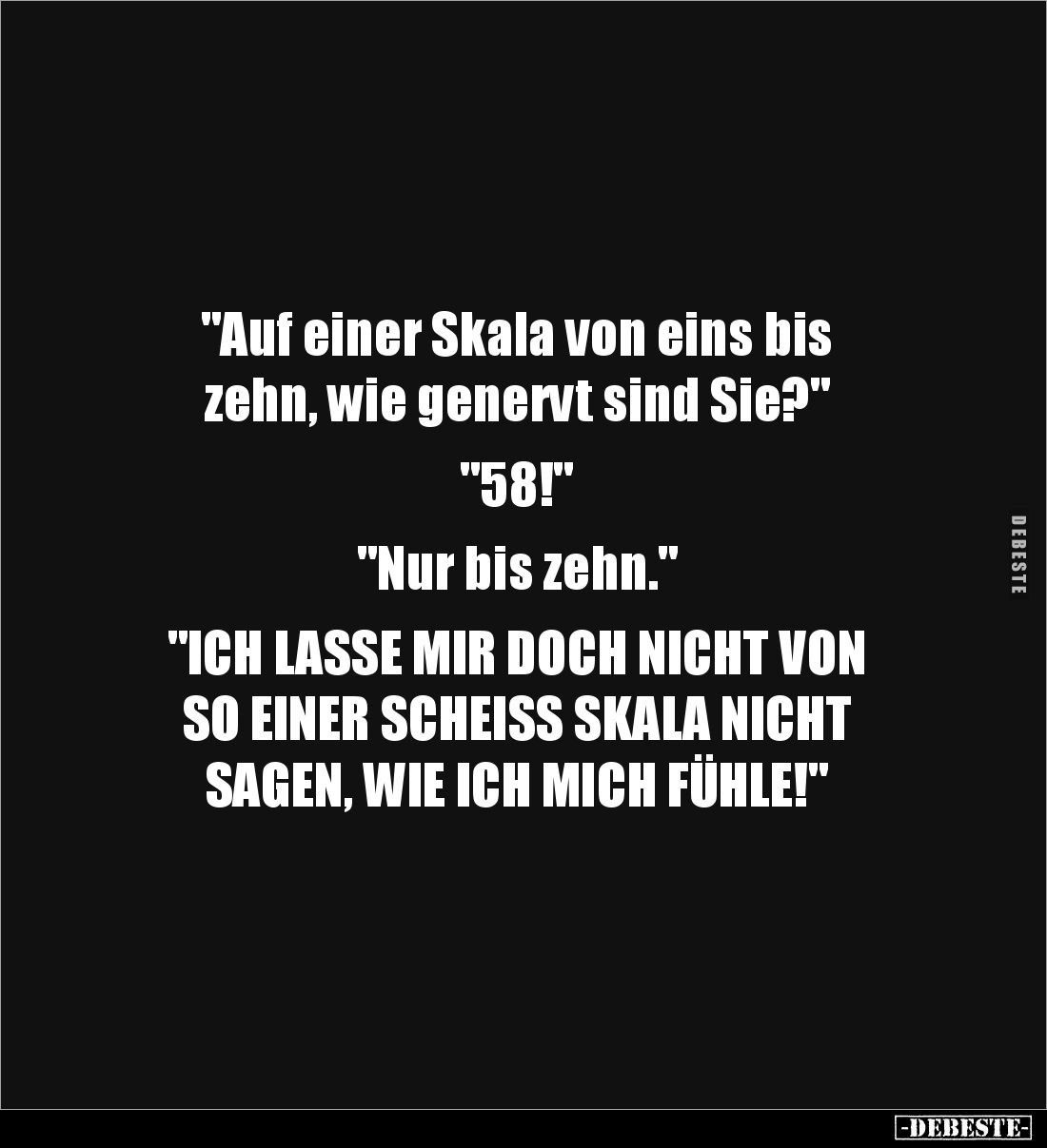 "Auf einer Skala von eins bis zehn, wie genervt sind Sie?" "58!" "Nur bis zehn." "ICH LASSE MIR DOCH NICHT VON SO EINER SCHEISS SKALA NICHT SAGEN, WIE ICH MICH FÜHLE!"