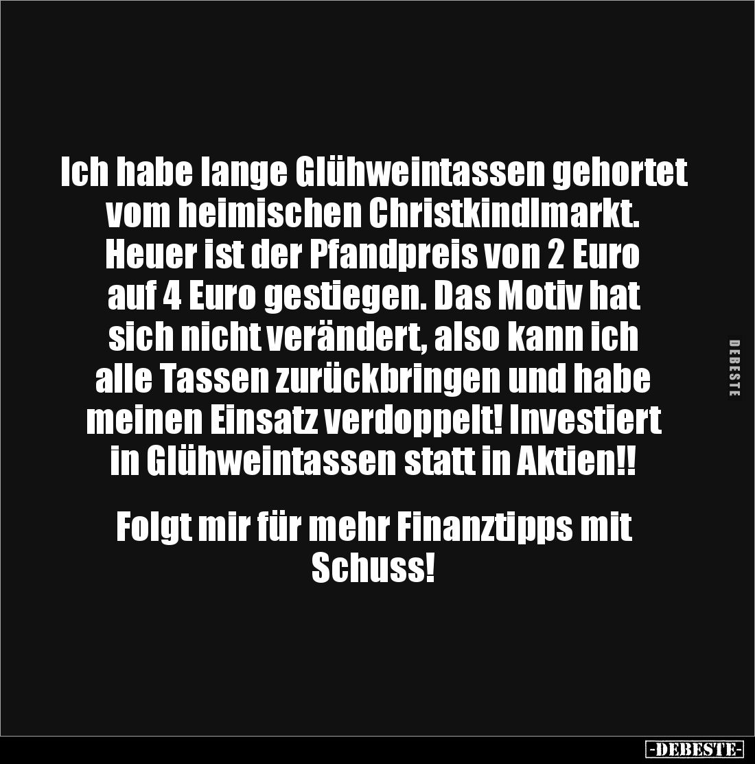 Ich habe lange Glühweintassen gehortet vom heimischen Christkindlmarkt. Heuer ist der Pfandpreis von 2 Euro auf 4 Euro gestiegen. Das Motiv hat sich nicht verändert, also kann ich alle Tassen zurückbringen und habe meinen Einsatz verdoppelt! Investiert in Glühweintassen statt in Aktien!! Folgt mir für mehr Finanztipps mit Schuss!