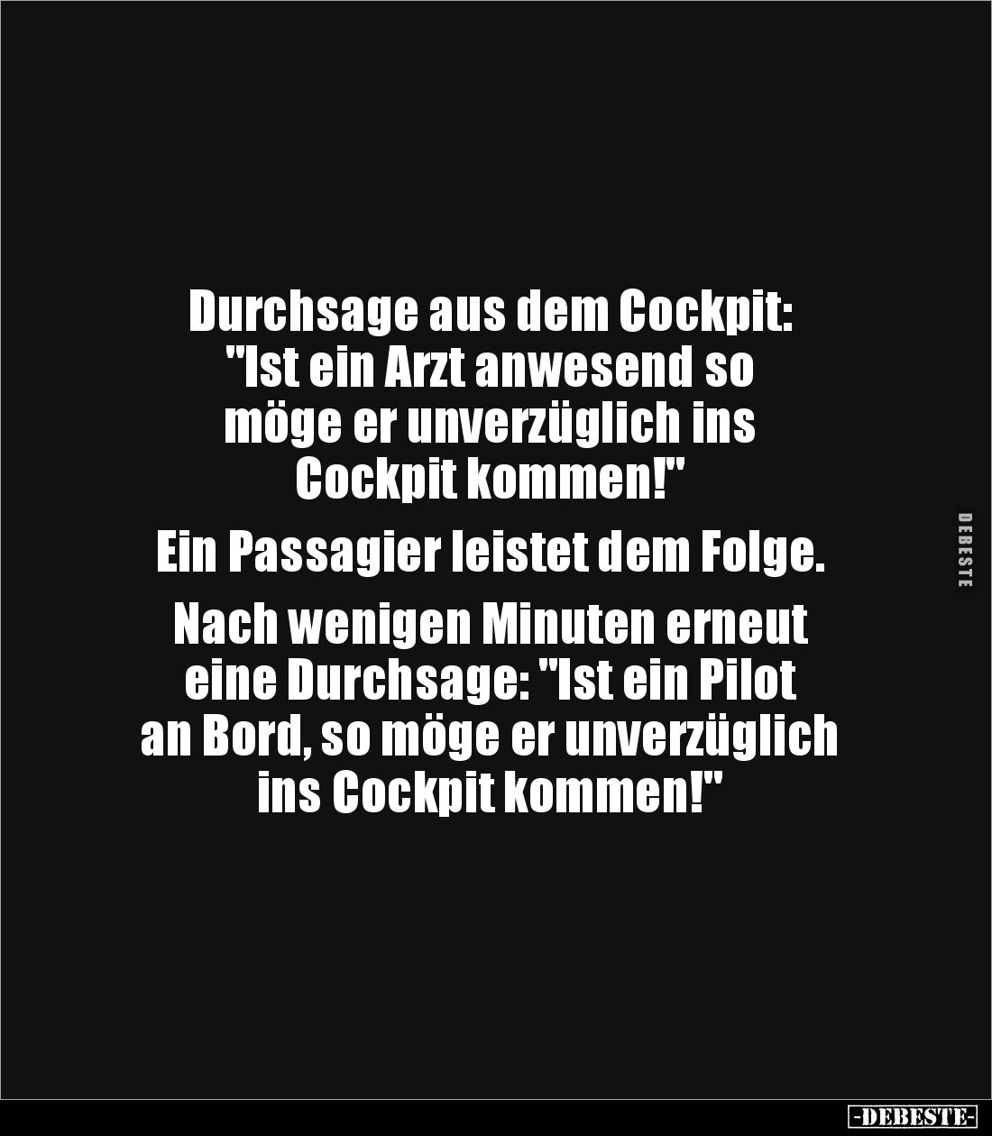 Durchsage aus dem Cockpit: "Ist ein Arzt anwesend so möge er unverzüglich ins Cockpit kommen!" Ein Passagier leistet dem Folge. Nach wenigen Minuten erneut eine Durchsage: "Ist ein Pilot an Bord, so möge er unverzüglich ins Cockpit kommen!"