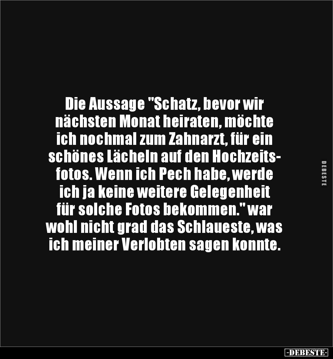 Die Aussage "Schatz, bevor wir nächsten Monat heiraten, möchte ich nochmal zum Zahnarzt, für ein schönes Lächeln auf den Hochzeits- fotos. Wenn ich Pech habe, werde ich ja keine weitere Gelegenheit für solche Fotos bekommen." war wohl nicht grad das Schlaueste, was ich meiner Verlobten sagen konnte.