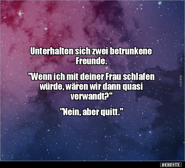Unterhalten sich zwei betrunkene Freunde. "Wenn ich mit deiner Frau schlafen würde, wären wir dann quasi verwandt?" "Nein, aber quitt."