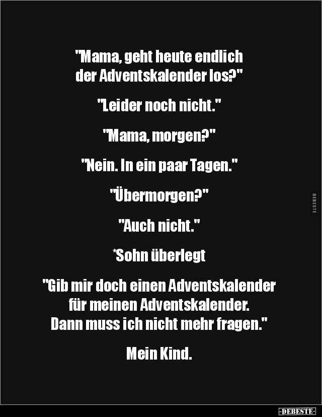 "Mama, geht heute endlich der Adventskalender los?" "Leider noch nicht." "Mama, morgen?" "Nein. In ein paar Tagen." "Übermorgen?" "Auch nicht." *Sohn überlegt "Gib mir doch einen Adventskalender für meinen Adventskalender. Dann muss ich nicht mehr fragen." Mein Kind.