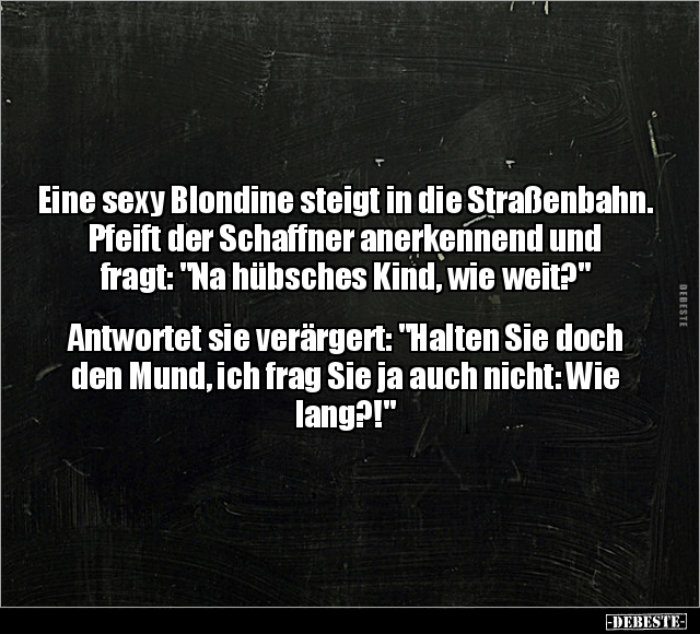 Eine sexy Blondine steigt in die Straßenbahn. Pfeift der Schaffner anerkennend und fragt: "Na hübsches Kind, wie weit?" Antwortet sie verärgert: "Halten Sie doch den Mund, ich frag Sie ja auch nicht: Wie lang?!"