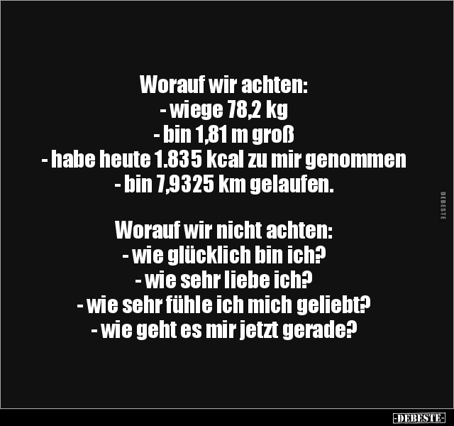 Worauf wir achten: - wiege 78,2 kg - bin 1,81 m groß - habe heute 1.835 kcal zu mir genommen - bin 7,9325 km gelaufen. Worauf wir nicht achten: - wie glücklich bin ich? - wie sehr liebe ich? - wie sehr fühle ich mich geliebt? - wie geht es mir jetzt gerade?