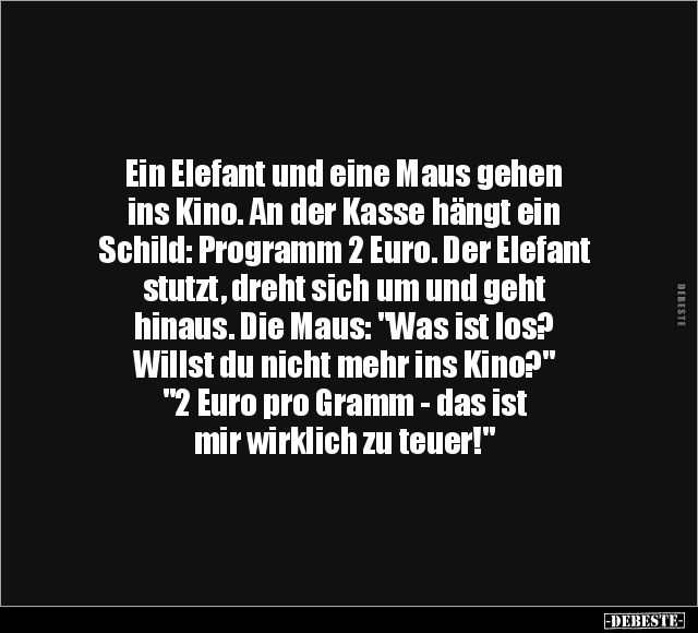 Ein Elefant und eine Maus gehen ins Kino. An der Kasse hängt ein Schild: Programm 2 Euro. Der Elefant stutzt, dreht sich um und geht hinaus. Die Maus: "Was ist los? Willst du nicht mehr ins Kino?" "2 Euro pro Gramm - das ist mir wirklich zu teuer!"