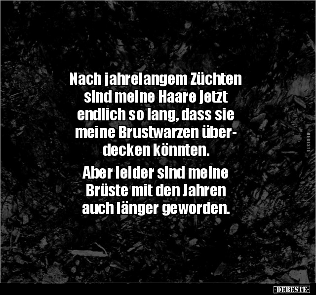 Nach jahrelangem Züchten sind meine Haare jetzt endlich so lang, dass sie meine Brustwarzen über- decken könnten. Aber leider sind meine Brüste mit den Jahren auch länger geworden.