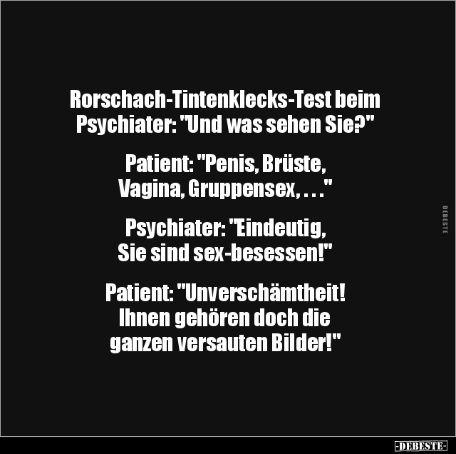 Rorschach-Tintenklecks-Test beim Psychiater: "Und was sehen Sie?" Patient: "Penis, Brüste, Vagina, Gruppensex, . . ." Psychiater: "Eindeutig, Sie sind sex-besessen!" Patient: "Unverschämtheit! Ihnen gehören doch die ganzen versauten Bilder!"