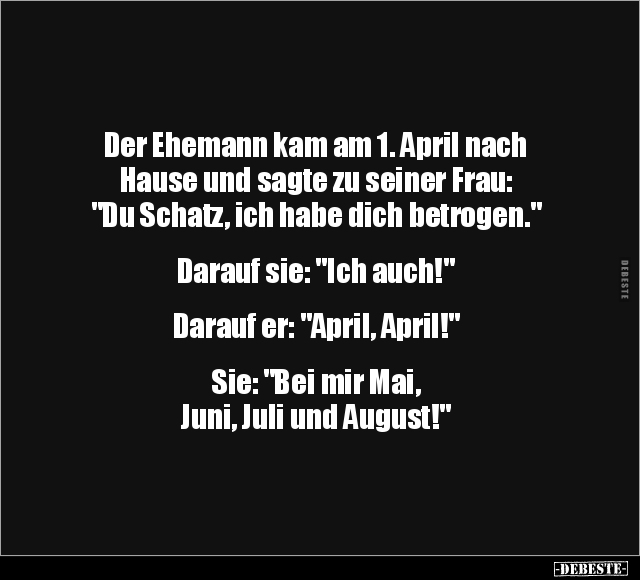 Der Ehemann kam am 1. April nach Hause und sagte zu seiner Frau: "Du Schatz, ich habe dich betrogen." Darauf sie: "Ich auch!" Darauf er: "April, April!" Sie: "Bei mir Mai, Juni, Juli und August!"