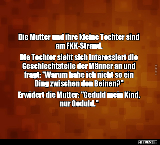Die Mutter und ihre kleine Tochter sind am FKK-Strand. Die Tochter sieht sich interessiert die Geschlechtsteile der Männer an und fragt: "Warum habe ich nicht so ein Ding zwischen den Beinen?" Erwidert die Mutter: "Geduld mein Kind, nur Geduld."