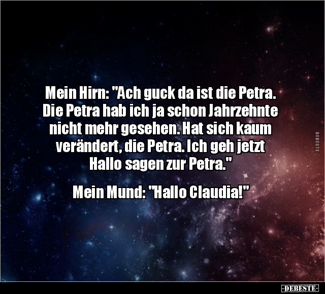 Mein Hirn: "Ach guck da ist die Petra. Die Petra hab ich ja schon Jahrzehnte nicht mehr gesehen. Hat sich kaum verändert, die Petra. Ich geh jetzt Hallo sagen zur Petra." Mein Mund: "Hallo Claudia!"