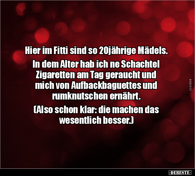 Hier im Fitti sind so 20jährige Mädels. In dem Alter hab ich ne Schachtel Zigaretten am Tag geraucht und mich von Aufbackbaguettes und rumknutschen ernährt. (Also schon klar: die machen das wesentlich besser.)