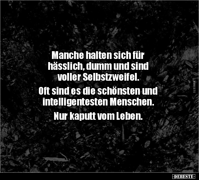 Manche halten sich für hässlich, dumm und sind voller Selbstzweifel. Oft sind es die schönsten und intelligentesten Menschen. Nur kaputt vom Leben.