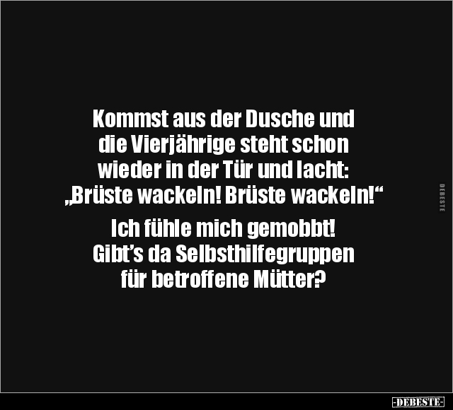 Kommst aus der Dusche und die Vierjährige steht schon wieder in der Tür und lacht: „Brüste wackeln! Brüste wackeln!“ Ich fühle mich gemobbt! Gibt’s da Selbsthilfegruppen für betroffene Mütter?