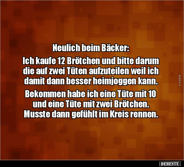 Neulich beim Bäcker: Ich kaufe 12 Brötchen und bitte darum die auf zwei Tüten aufzuteilen weil ich damit dann besser heimjoggen kann. Bekommen habe ich eine Tüte mit 10 und eine Tüte mit zwei Brötchen. Musste dann gefühlt im Kreis rennen.