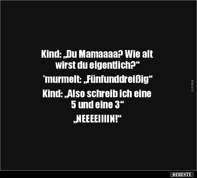 Kind: „Du Mamaaaa? Wie alt wirst du eigentlich?“ *murmelt: „Fünfunddreißig“ Kind: „Also schreib ich eine 5 und eine 3“ „NEEEEIIIIN!“