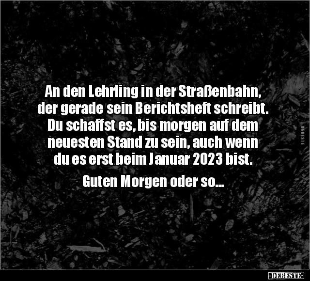 An den Lehrling in der Straßenbahn, der gerade sein Berichtsheft schreibt. Du schaffst es, bis morgen auf dem neuesten Stand zu sein, auch wenn du es erst beim Januar 2023 bist. Guten Morgen oder so...