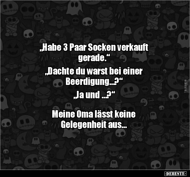 „Habe 3 Paar Socken verkauft gerade.“ „Dachte du warst bei einer Beerdigung…?“ „Ja und …?“ Meine Oma lässt keine Gelegenheit aus…